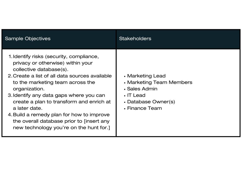 Define at most 3-5 objectives of your data audit, then those objectives with at least 2-4 key stakeholders who are closely invested in the health of your overall data or may be imperative to the audit itself. Below is a sample set of requirements you can use as a baseline for your upcoming audit.