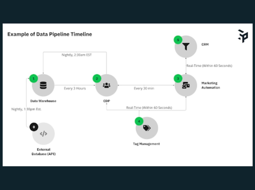 During your audit, delve into the timeline of data imports and their synchronization with marketing and sales activities. This involves making decisions regarding real-time versus batch deployments, the optimal timing for these deployments, and their interdependencies. The diagram below illustrates a multi-platform deployment example, showcasing the interconnected nature of data flow.