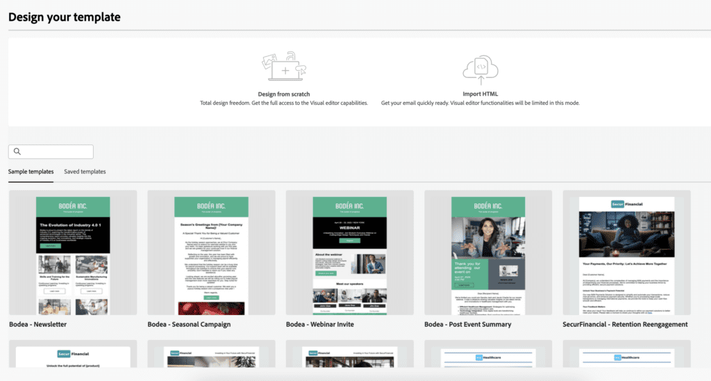 As a designer by trade, this new editor offers a major win with this feature! You can now save any personalized or highly detailed emails as reusable templates directly from the email interface – it’s a huge time-saver for marketers, designers, and developers alike. Even better, you have the option to save as either Email Templates OR as Fragments for even greater flexibility in dynamic email creation. This means creating new email templates no longer requires any coding (unless of course you’d prefer it!), unlike the previous template builder, which relied solely on a pre-coded and configured set of modules. This empowers both designers and marketers to quickly create templates based on their immediate needs, which the team can then standardize for various campaign types, from webinars to gated content to newsletters. Just like the last editor, Adobe has provided a set of example templates for you to start from, or you can use the easy builder to create your own.