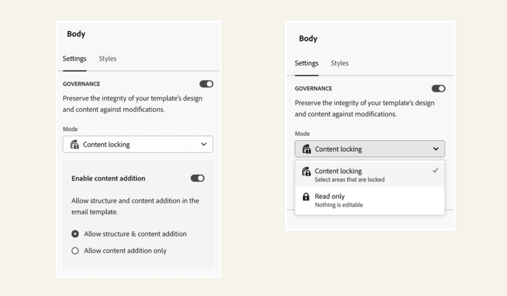 While some favor content flexibility, others are concerned about what flexibility can do to the brand equity of their emails. With the Content Locking feature, you can protect specific email sections from unintended modifications, ensuring brand consistency and avoiding accidental alterations. This new editor also brings all brand management with Themes & Guidelines directly into the editor for consistent styling across all your email communications. Simply apply your brand guidelines and see how they’re executed in your email.