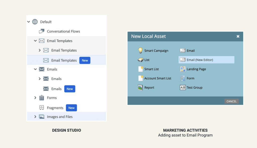 - Marketing Activities: Within an email program in Marketing Activities when creating a new local asset.