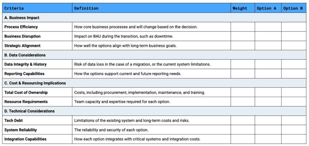 - Score each option based on how well it aligns with your needs. For example, if you migrate to a new instance, you might lose historical data, so you’d score Data Integrity & History lower for that option.